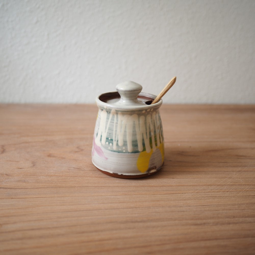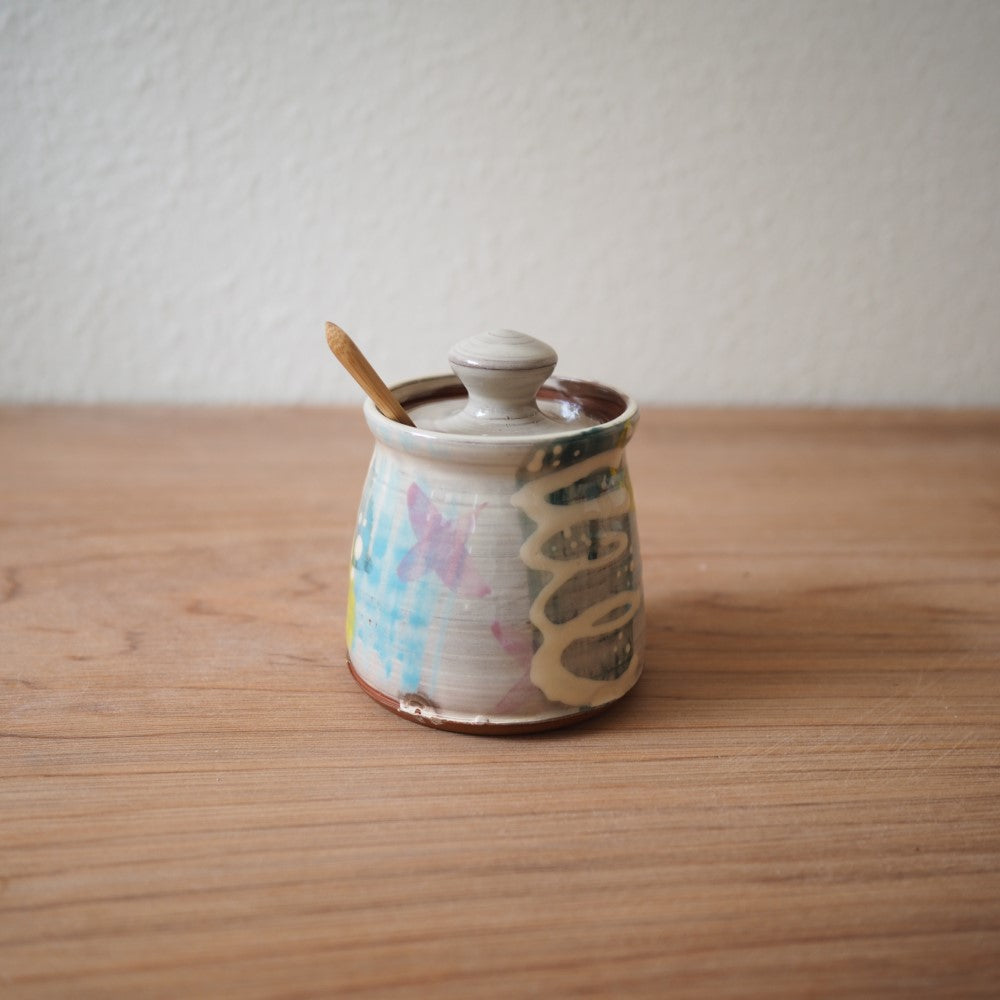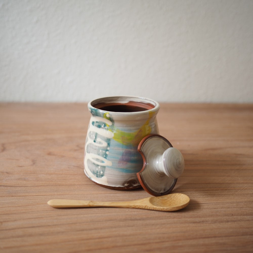 Sukkerskål, marmeladekrukker, sennepskrukke... Kært barn har mange navne. Drejet og dekoreret lågkrukke af Han Nguyen med en lille udskæring til en teske. En bambusske følger med krukken.